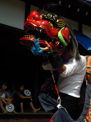 宿では「花」がよばれ、それぞれ特徴的な舞が続けられていきます。最後は八幡神社の神前に到着すると、「宮上り」で華やかな花火と共に境内に向かいます。夜10:00頃の予定で「獅子殺し」が行われます(ただ、いつも日付が変わるころになるようです)。「獅子殺し」では、天狗の細かい動き、斬られた獅子の激しくもだえる動きなど、ダイナミックな舞です。