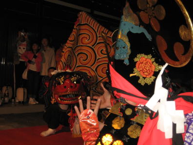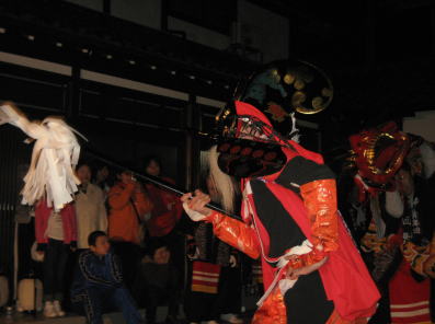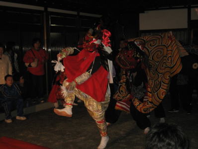 愛宕神社の春祭りに奏演される獅子舞は、森寺青年団によって舞われます。赤く大きな獅子頭、元気な天狗が舞います。また天狗の赤地の上着が目に付きます。わたくしが訪れたのは2007年と2009年の春祭り。村廻りと宿での舞を見ることができました。特徴的なのは、大きな花のときの「カイチュウクズシ」や「獅子殺し」といった演目のときの大天狗が黒塗りです。地元の商店の方により作られたものだといい、森寺オリジナルだそうです。何とも怪しげな雰囲気が醸し出されます。