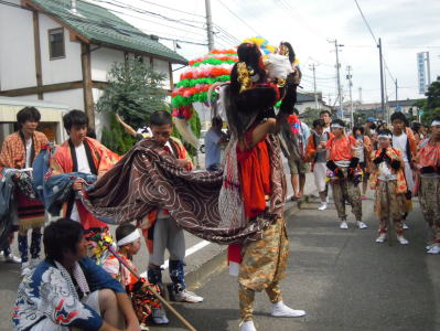 当日は、朝 6:00に神明神社への宮入の後、町内巡行、休憩を挟んで夕刻まで続きます。夜は「招待花」のお宅での演舞が続き、22:00頃から最後の巡行を続け、23:00過ぎには<宿入り>となり、現在の「獅子宿」である大坪町三・四丁目公民館前で、全演目が奏演されます。ちなみに「獅子殺し」はありません。