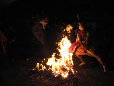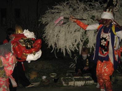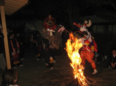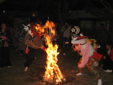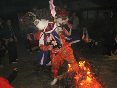 大浦地区は氷見市でも南東部、山手寄りの地区。春祭りに獅子舞が舞われます。耳まで赤い大型の獅子頭には大きな金の角が生えています。「獅子殺し」はないそうですが、宿では、地面に敷いた藁に火を着け、その周りで獅子と天狗が相対するように舞われます。「タツブリ」というそうですが、見応えがあります。