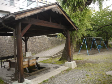 松本市のシンボル・松本城の北側のお濠の脇の下ったところのミニ公園のような場所にあります。このあたりは湧水が多いようです。東屋と井枠が作られていました。水量は大変豊富です。その脇には柳の大木もあって、涼しげな雰囲気を演出してくれています。