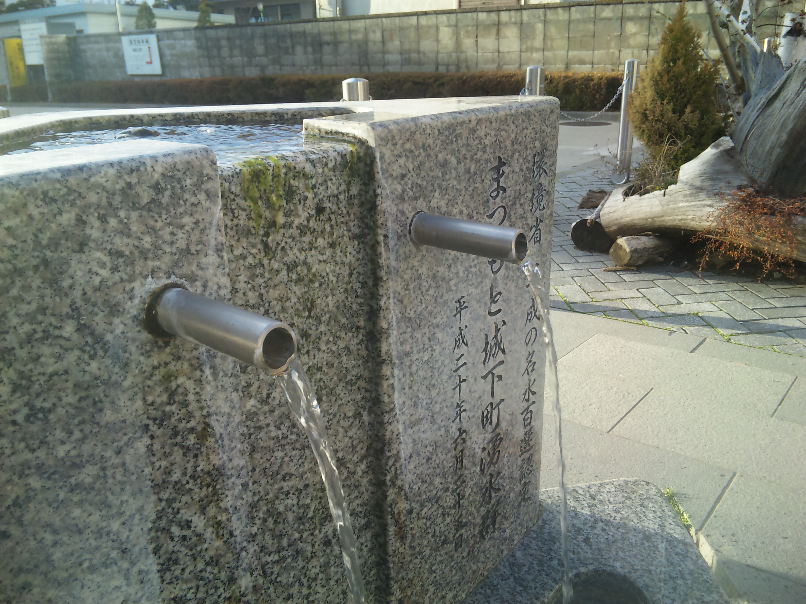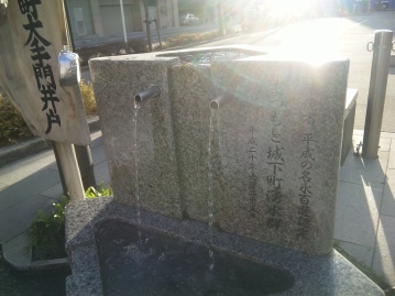 城下町松本は湧水が多い街でもあります。この井戸は、平成の名水百選に認定された「まつもと城下町湧水群」の1つで、2007年に「水めぐりの井戸整備事業」で作られた最初の井戸だそうです。場所は松本城正面へ向かう道を行くと、かつて大手門があった、大名町通りの角にあります。三角柱を重ねたようなしゃれた井戸で、きれいに整備されています。