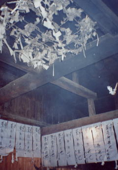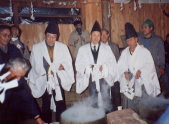 面の舞が終わり、祭りの終盤になると、かまどの前で歌を歌い、幣を湯の上の飾りに向かって投げ込む。