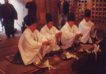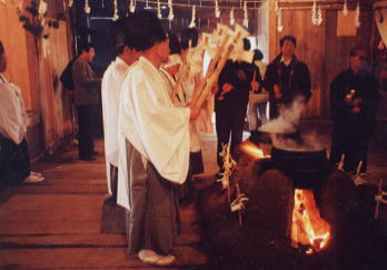 湯木(ゆぼく)を持ち、かまどの前で歌いながら湯を捧げます。