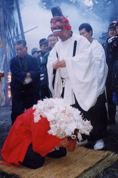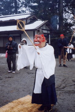 <八幡>は鬼のような面で、拝殿前で問答、印を結んだ後、「駒」にまたがって、退場となる。