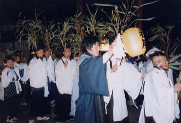 <乱声>の後、庁屋から笹を持った人々が、これから繰り広げられる面形の舞の場=庭を開く。