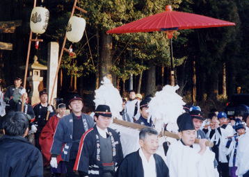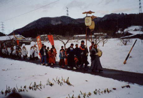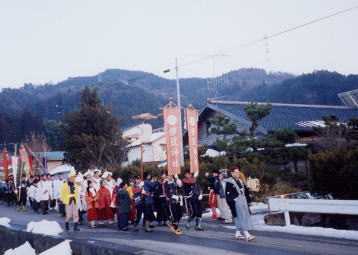 諏訪神社を出発し、新野の集落を通り、伊豆神社まで行列が進む。