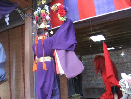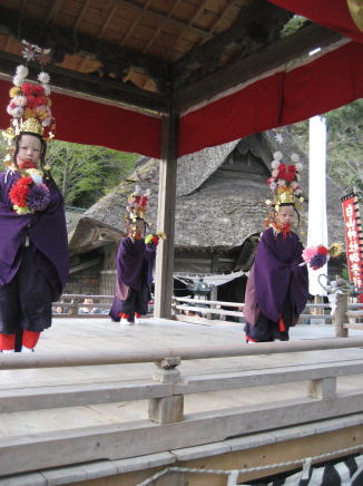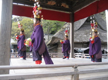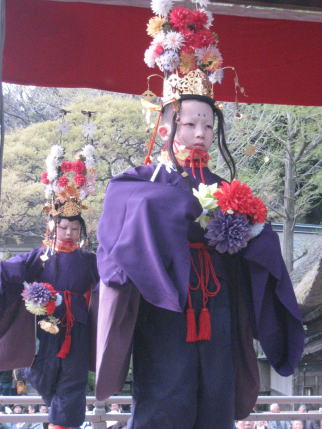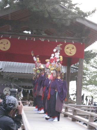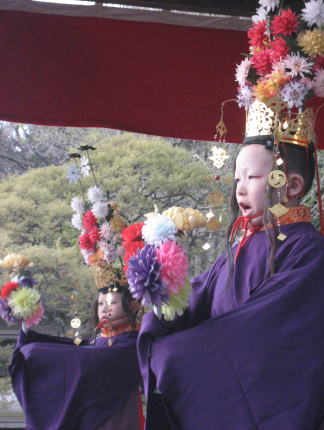 舞楽の10番目は「輪歌」。4人の稚児舞で、手に持つ花は、社参の行列の時に竹に下げられたもの。稚児舞の最終演目で、装束は紫色で「児抜頭」と同様である。橋がかりをいながら退場し、次の「陵王」とは切れ目なしに奏演される。