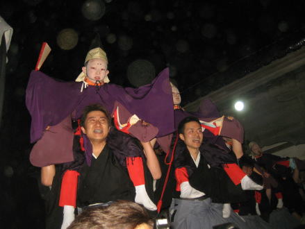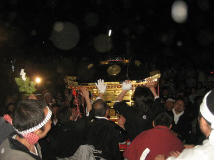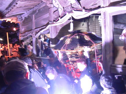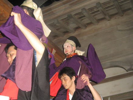 舞楽の11番目は「陵王」が楽屋へ飛び込むと、橋がかりは外され、御旅所にあった神輿を一気に拝殿へ担ぎ出し、神様をお返しする。そして「空」になった神輿を再び御旅所へ返す。このとき、橋掛かりでは、稚児が担がれる。
