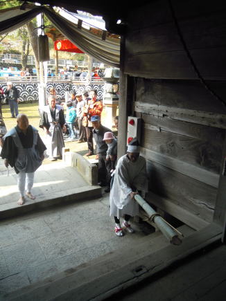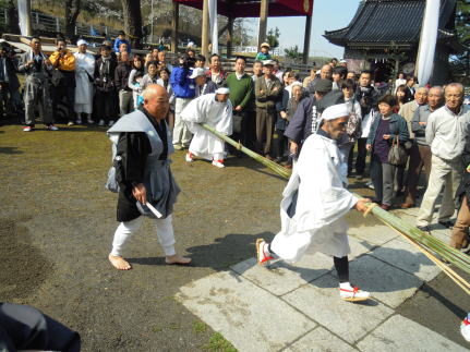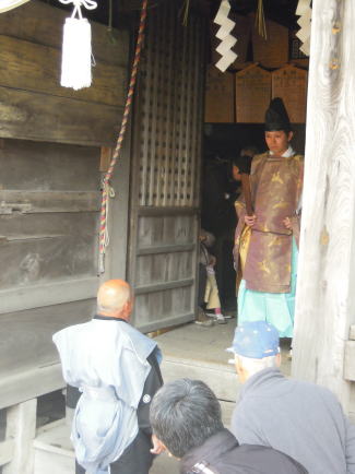舞台での修祓の間、楽屋から拝殿の社人に使いが出る。割竹を持つ白丁の先導で、裃に裸足で尻端折りの神使が、拝殿入口で、7回に渡って口上を述べる。