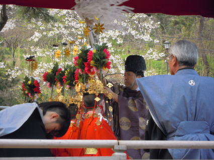 舞台での修祓。肩車によって社参してきた稚児達は、橋がかりで降ろされ、舞台上で楽人達と神官によるお祓いを受ける。
