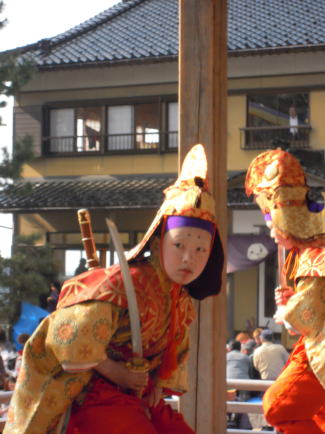 舞楽の6番目は「泰平楽」。中央の舞楽で言う「太平楽」という演目にあたる。きらびやかな衣装で、鳥甲(とりかぶと)を被る。4人の稚児舞で、橋がかりで鉾を五の戸から受け取って登場。舞は何も持たない「徒手の舞」、鉾を持つ「鉾の舞」、太刀を抜いて舞う「太刀の舞」などいくつかに分かれている。