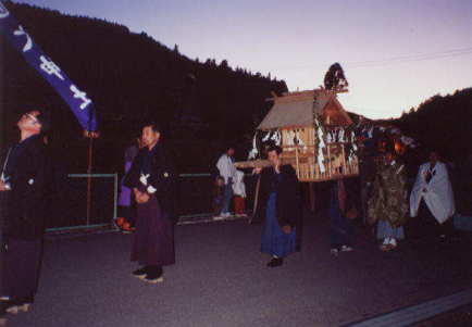 夕刻、大河内の集会所から池大神社へ向けて、<お登り>の行列が進む。