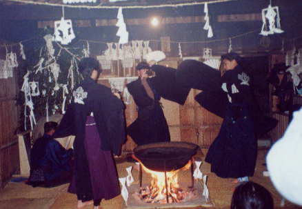 扇と鈴を手に持ち、大きな袖をひるがえしながら舞う。