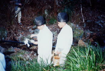 神社裏手の山道を登り、湯立てに使う神聖な水を汲む。