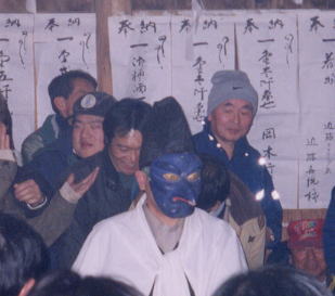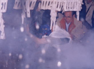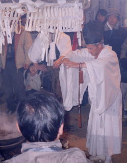 秋葉神は青い顔の烏天狗。先だって登場する祢宜も二の釜で湯切りを行い、やがて秋葉神も2回湯を切ります。
