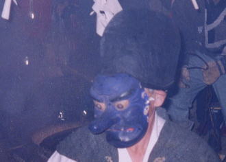 日天に続いて登場し、湯切りをします。数珠を携え、印を結ぶ等の所作の後、湯を切ります。一の釜、二の釜それぞれで行います。面は青い鼻高面で、明治期のもの。