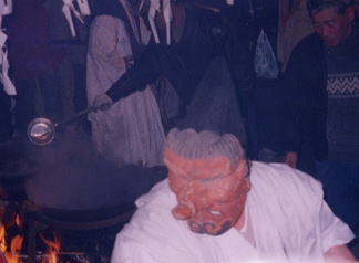 面の舞のトップ。数珠を携え、印を結ぶ等の所作の後、湯を切ります。一の釜、二の釜それぞれで行います。面は素朴な感じで、江戸時代前半まで遡るようです。