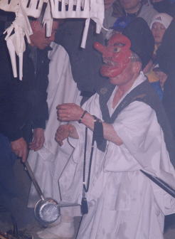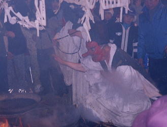 津島天王社分の日天。数珠を携え、印を結ぶ等の所作の後、湯を切ります。一の釜、二の釜それぞれで行います。