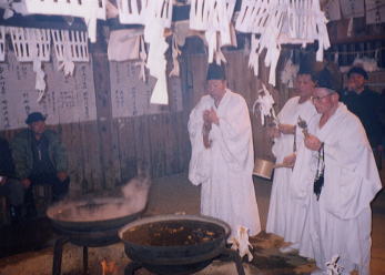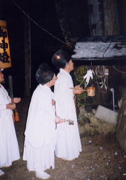 祢宜が三大夫の家へ湯を持って出かけ清めを行ってくる。その間、神社では神社内のいたるところを湯をもって清める。