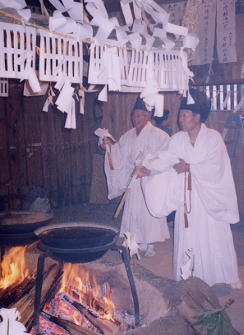 最初の湯立て。三角形の覆面をして、2人ずつ釜に相対するように4人で、数珠を揉み、五大尊の呪文を唱え、九字を切ります。四方で行ってから、湯木を持って舞い、湯を跳ね上げながら神々に湯を献じます。