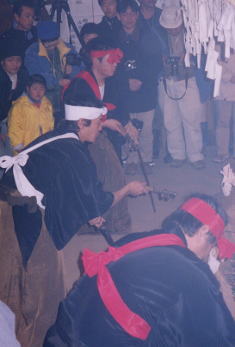 赤の鉢巻、襷姿が4人、白の鉢巻、襷姿が4人の8人で舞われる。最初扇と鈴で舞い、途中から刀に替えて刀の輪くぐりなどを行う。