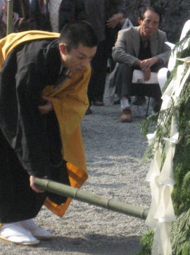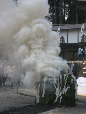 火の中に木札を投げ入れる