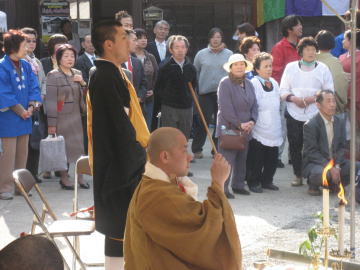 法螺貝の先導で観音堂前に集まる