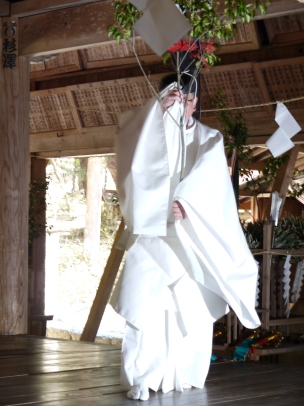 第二座の舞。五穀豊穣、蚕飼安全、天下万民に幸あれとの祈願の舞。大振りの榊を持って舞う。白衣の神司の姿は神々しい。