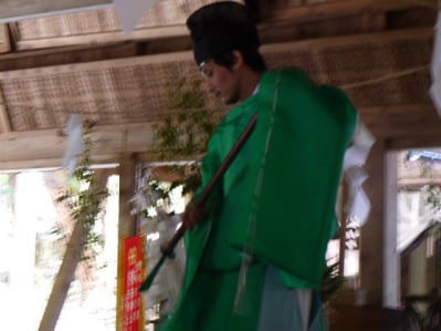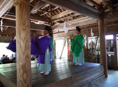 第一座の舞。いわゆる天岩屋戸伝説の舞ではなく、神楽の最初で、鉾を振ることで舞台を清める舞。鈴合せ、鉾合わせといった所作に、入れ替わりの美しさがある。