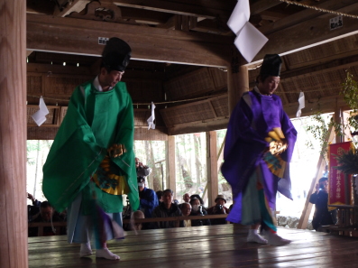 第五座の舞。鈴と扇を持った2人の神司が、背中合わせで逆に廻るのが特色という。