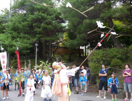 神輿渡御を先導する天狗は地区内の注連縄を薙刀で切りながら進んでいく。