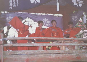 赤い装束が印象的なこの舞は、「ドウホーイワテーテズテズ…」といった唱歌が唱えられる。