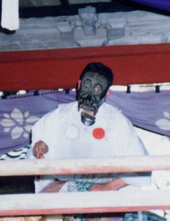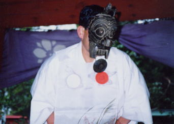 大人4人で舞います。初めに「陵王」面で舞います。途中で