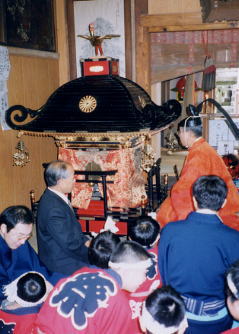 拝殿内での神事。神官の祝詞奏上等の後、神輿には御神体をお遷しする等の神事が続く。