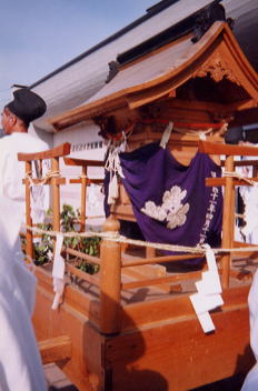 お練りの出る中央公民館に遷されていた、子檀嶺神社の御神体を安置した神輿。