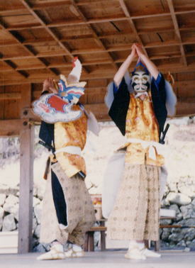 1番目の演目。背中合わせで体をよじる所作が多い。九字も切る。終盤に抜刀し、右足で「鬼」の字を書いて踏む。最後「目出度く候」で終わる。